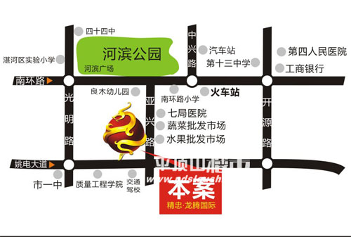 龙腾国际紧临姚电大道和亚兴路,向东500米接开源路和高速引线;向西400米接光明路和平桐路,向南50米接新南环路。门前有3路、4路城市公交和多条城乡汽车线路。