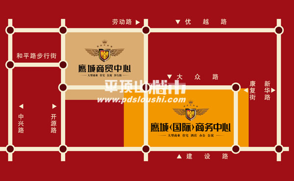 鹰城(国际)商务中心位于建设路与劳动路交汇处,南临平顶山纵贯东西的城市迎宾大道建设路,交通极为便捷,具有商务办公的先天优越性。项目集合5A级写字楼、时尚公寓、五星级酒店、特色商业步行街、高尚住宅等多种业态,强调一站式消费、一站式服务,构建一个集酒店、办公、公寓、商业、居住、娱乐、休闲等功能于一体的复合型商务中心,打造区域内地标式建筑群。