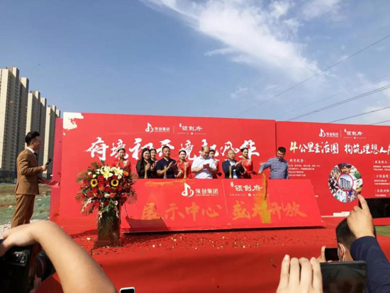 随着致辞结束,此次开放盛典迎来高潮。在现场来宾的共同见证下,领创集团众领导登台启动了鎏金沙,伴随着彩虹机喷射漫天金箔,在一片欢呼声、喝彩声中,大地·领创府展示中心盛大开放。